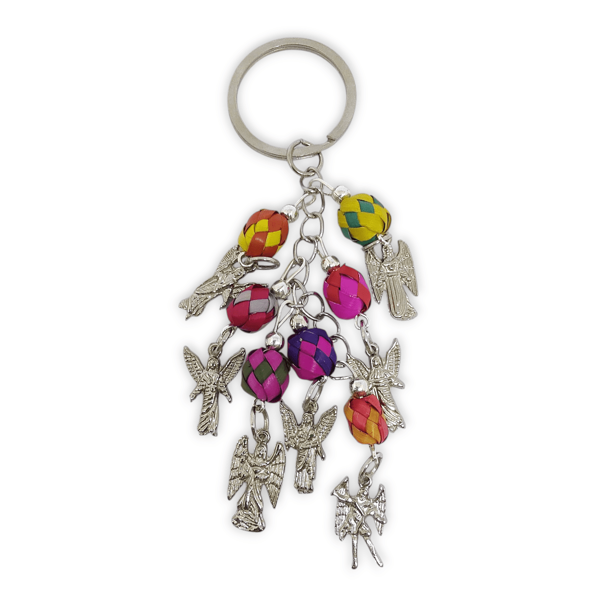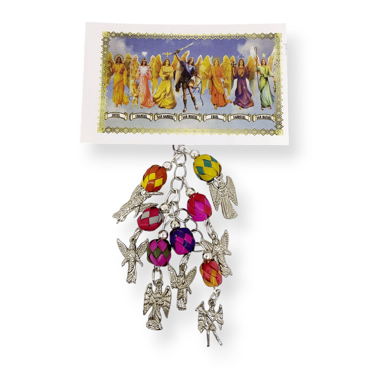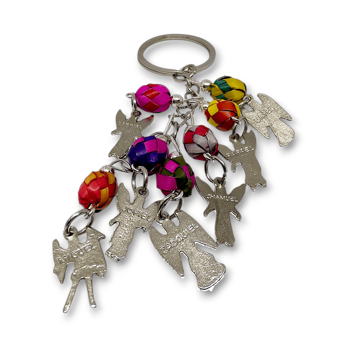 Llavero 7 Arcángeles con esferas de palma de colores, hecho por artesanos mexicanos.